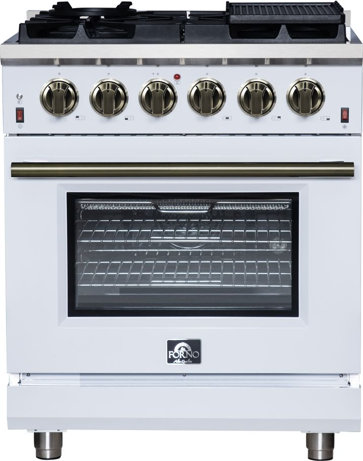 The Forno Massimo 30 Inch Gas Range harmonizes professional style and durability with Antique Brass. Its 5 sealed burners, totaling 68,000 BTU, include a precision 20,000 BTU dual-ring burner that can simmer at 1,000 BTU. Continuous cast iron grates ensure stability on the enamel surface.Read More