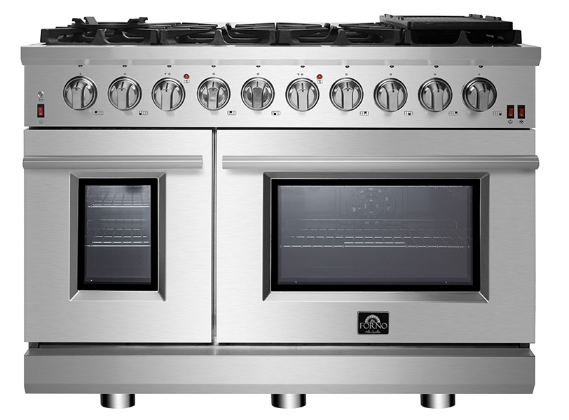 The Forno Massimo 48 Inch Gas Range harmonizes professional style and 304-grade stainless steel durability. Its 8 sealed burners, totaling 107,000 BTU, include a precision 20,000 BTU dual-ring burner that can simmer at 1,000 BTU. Continuous cast iron grates ensure stability on the enamel surface. The main oven of 4.32 Cu. Ft has a convection fan with 30,000 BTU Total Broil and Bake output. The secondary oven has a capacity of 2.26 Cu. Ft. with a 14,000 BTU Bake output. Both ovens have an impressive blue enamel interiors allowing for easy cleaning and 3-layer glass oven door window provides both heat retention and an unobstructed view. It features 2 telescopic racks per oven, an air fryer kit, a wok support, two reversible griddle, an LP conversion kit, and durable zinc-coated metal knobs. Elevate your kitchen with performance, convenience, and enduring elegance.Read More